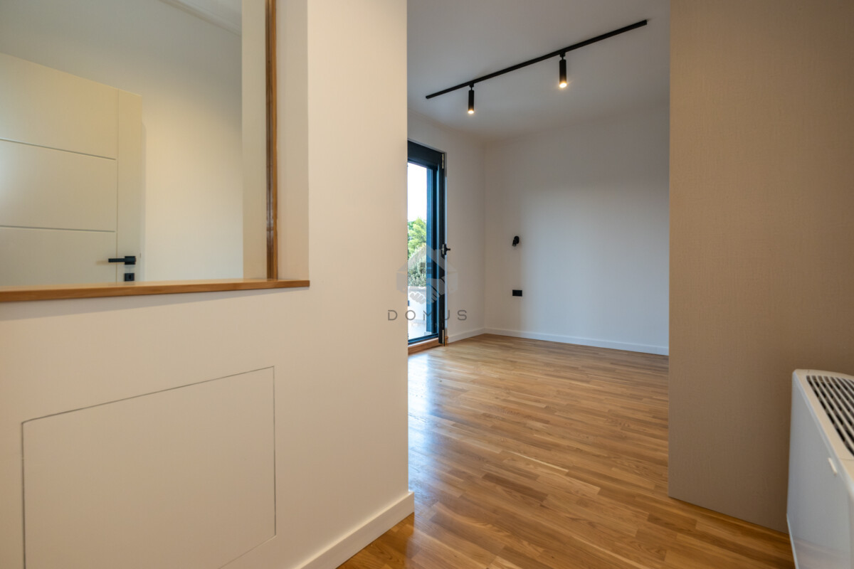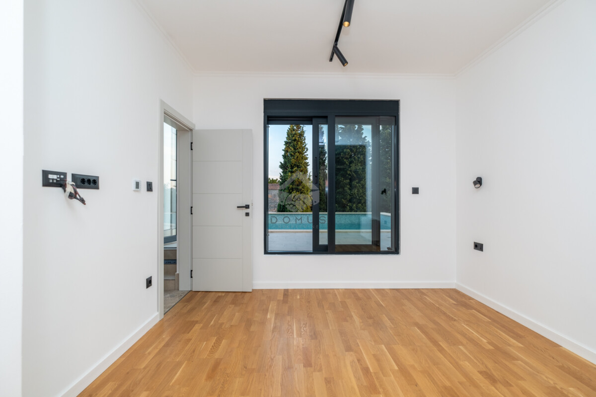 Na prvom spratu je master spavaća soba sa kupatilom i izlazom na bazen, dodatna spavaća soba, kupatilo, kao i prostor predviđen za saunu ili kancelariju.